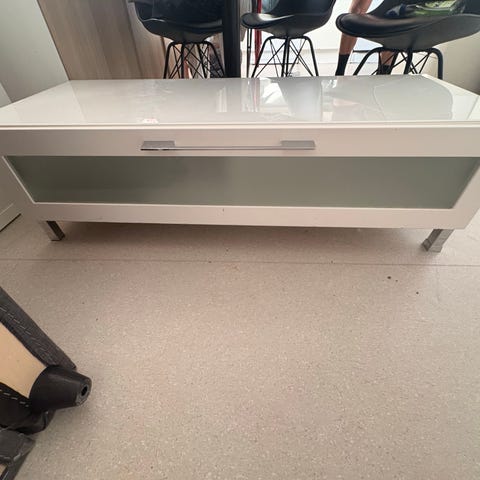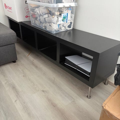 TV-taso IKEA:sta, päällystetty beigen värisellä puukuviollisella tapetilla.