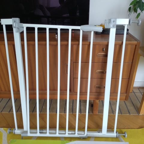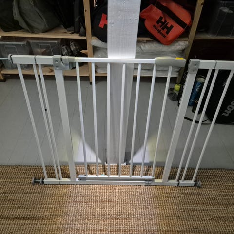 Toimiva musta Hauck turvaportti ja kaksi jatkopalaa, toinen musta ja toinen tummanharmaa (harmaasta erillinen kuva). Vain nouto.