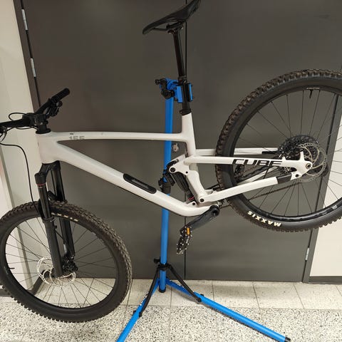 Cube Stereo One22 maastopyörä unisex-käyttöön. Rungon koko XS ja kiekkojen koko 27.5". Väri vaaleansininen. Sopii maastoajoon ja yleiseen pyöräilyyn, jousitettu etuhaarukka ja levyjarrut (näkyvät kuvissa). Runkoon merkitty malli Stereo One22, koko XS ja 27.5"-kiekot. Pyörässä on tasainen ohjaustanko ja satula säädettävissä ajajan pituuden mukaan.