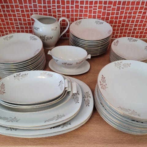 Kannu, tarrjoilukulho lautasella ja kaksi tarjoikulautasta.