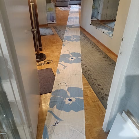 Kahdesta kappaleesta ommeltu pöytäliina. Toisella puolella kahvitahroja, en ole koittanut poistaa enkä antaa takuita, ovatko poistettavissa.