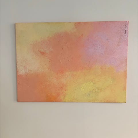Myydään kaksi taiteilija Tuire Hämäläisen abstraktia taulua.