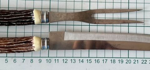 Vintage paistiveitsi ja paistihaarukka. Aterimissa on tummanruskeat kahvat, jotka on muotoiltu jäljittelemään sarvea tai luuta, ja niissä on vaaleat koristeelliset päätykappaleet. terä- ja haarukkaosat ovat valmistettu ruostumattomasta teräksestä.