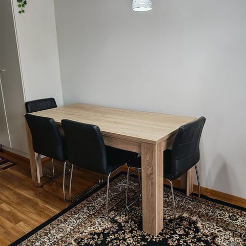 Very good JYSK dining table and 4 chairs. The table surface is very clean and chairs are also very good. No wear or tear. No stains. There are some marks of usage but these are very normal.