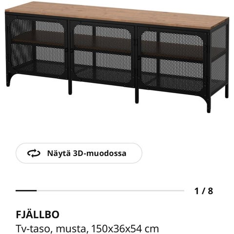 Ikea Bestå tv-taso. Voi käyttää sivupöytänä tai lipastona. Tummanruskeat ovet ja vaalea runko. Takaa toinen takalevy puuttuu.