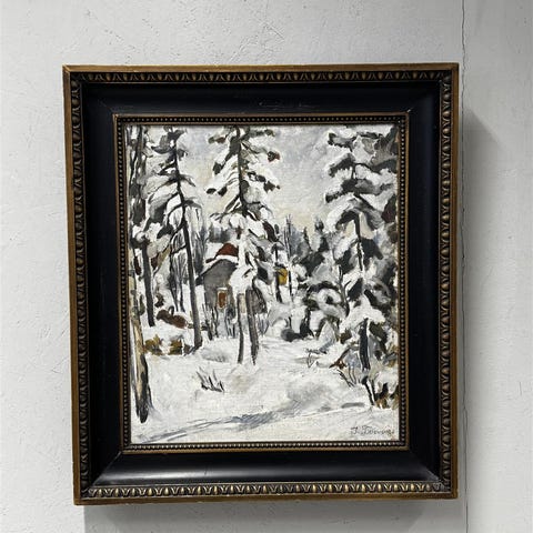 Taulu Talvimaisema öljyvärimaalaus kankaalle. Teos esittää talvista maisemaa, jossa virtaa joki lumisessa metsässä. Kehystetty koristeellisella kehyksellä.