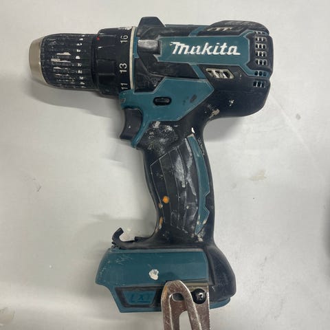 Makita BDF343 porakone akulla ja laturilla, työkalusetti ja säilytyslaatikko.