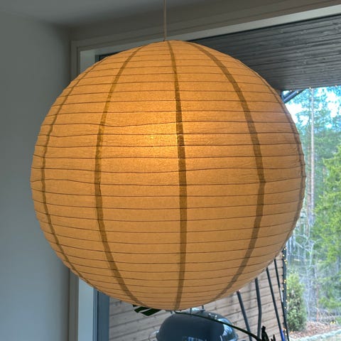 Granitista ostettu suuri riisipaperivalaisimen varjostin. Väri on vaalea harmaa. Halkaisija 80cm.