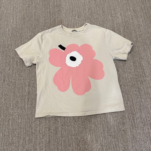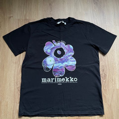 Marimekko naisten T-paita kokoa M. Violetti puuvillainen paita, jossa edessä suuri kukkapainatus ja tekstiä kuvion ympärillä. Takana yläreunassa pieni Marimekko-logo. Materiaali on 100 % puuvillaa. Sopii arkipukeutumiseen ja kerrospukeutumiseen.