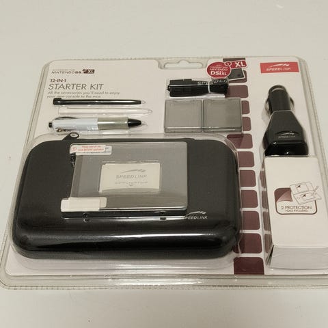 Mukaan DSi XL konsoli, laturi, mario teemainen kosketusnäyttökynä ja viisi peliä.