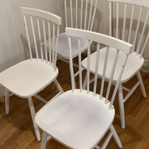 Alunperin valkoisen väriset pinnatuolit nyt mustaksi maalattuina myynnissä. Yleiskunnoltaan ihan hyväkuntoiset tuolit. Muutamissa kohdissa pieniä maalivaurioita ja jälkiä päällisistä, jotka saa mukaan.