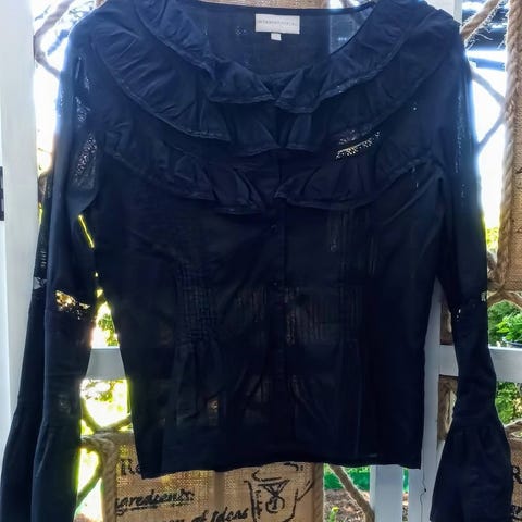 Käyttämättä jäänyt Lolita tyylinen paitapusero pystykauluksella, röyhelöillä ja puhvihihoilla. Naisellinen malli ja leikkaus. Merkkiä Sugar, made in Thailand. ko S-M. Kainalo-kainalo 47cm, kangas ei jousta paljoa. Puuvillaa.