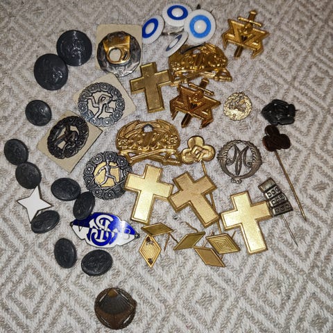 Sekalainen kokoelma rintanappeja ja pinssejä