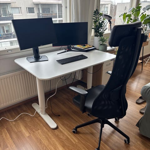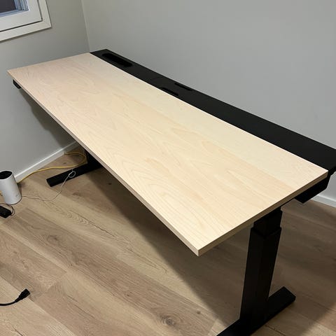 Avaamaton Ikea Mittzon sähköpöytä mustalla pöytälevyllä.