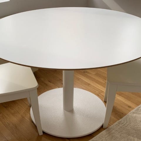 Ikeasta hankittu valkoinen pyöreä pöytä. 118cm halkaisijaltaan. Korkeus 74cm.