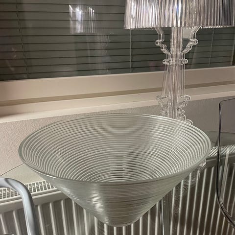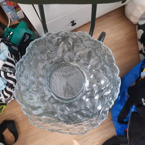 Iso kulho, halkaisija 22,5cm, korkeus 13,3 cm. Noin 4,8 litraa. Reunassa pieni naru-ura ympäri kulhoa, johon voi laittaa halutessa koristenyörin. Ehjä, Erinomaisessa kunnossa. Nouto Ullanlinnasta.