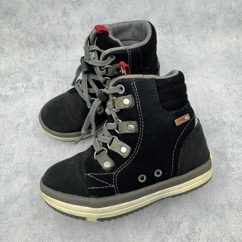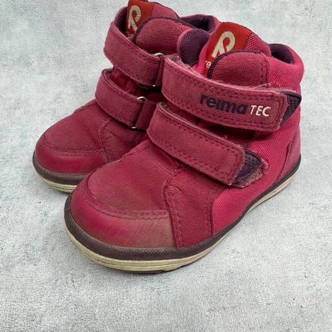 Erittäin hyväkuntoiset vaaleanpunaiset Reiman välikausikengät. Aran värin vuoksi pientä tummentumaa pinnalla, mutta yleisilmeeltään oikein siistit, tarrat pitää erinomaisesti ja kengät on testattu vedenpitäviksi juoksevan veden alla.