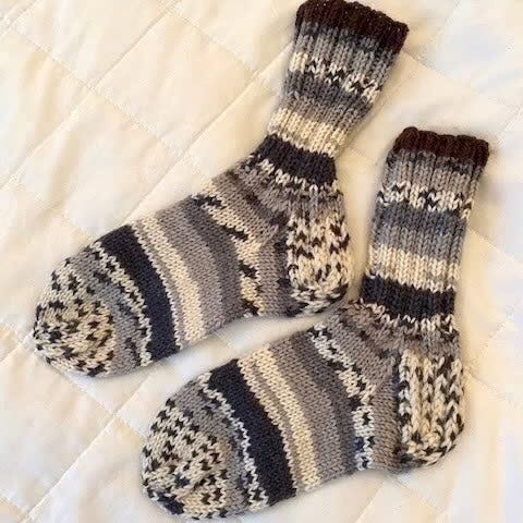 Ompelijan tekemät suloiset villasukat satiininauhalla. Jalanpohja n. 9,5cm. Siisti hyväkuntoiset.