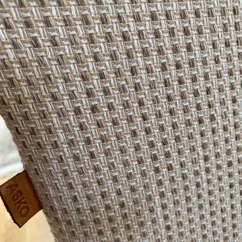 Kulmasohva, jossa vaalea beige kangasverhoilu ja metallijalat. Sohva muodostuu useammasta osasta, irrotettavia, jotka yhdessä muodostavat L-muotoisen kokonaisuuden. Istuinosat ja selkänojat ovat pehmustetut
