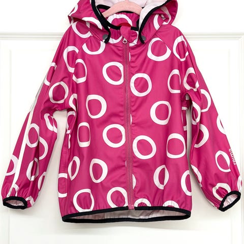Reiman pinkki ruudullinen sadetakki kokoa 110. Sisäpuolella hieman tummentumaa, muuten oikein siisti.