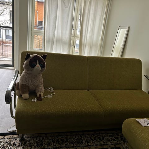 Kaksi pientä tyynyä mukaan tarvittaessa, samaa kangasta kuin sohva.