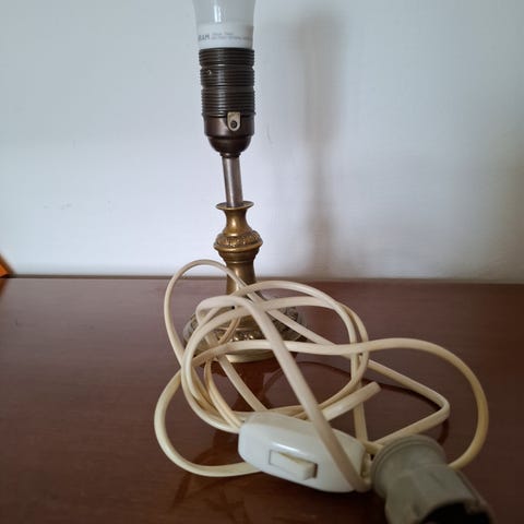 Pöytälamppu, jossa iso polttimo. Jalka betoniharmaa, jossa messinkinen reunus.