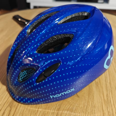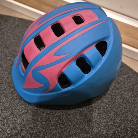 Lasten pyöräilykypärä, koko 48–54 cm (S). Pinkki kypärä, jossa kissakuviointi. Sisäpuolella pehmusteet ja säädettävät hihnat. Paino 225 g. Ei kaaduttu. Hieman vaaleampi livenä kuin huonossa valaistuksessa kuvissa.