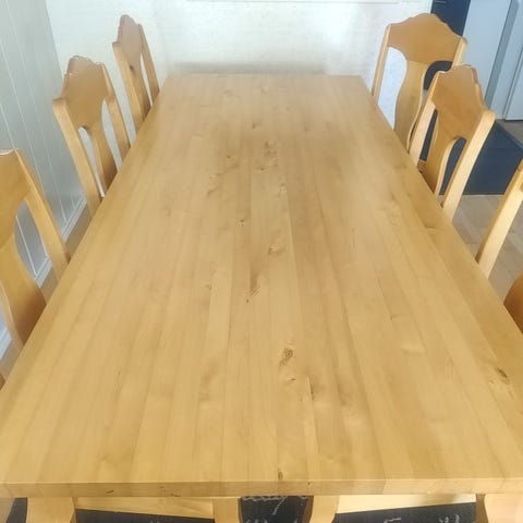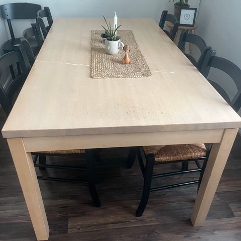 Hieno, pienehkö tukeva (painava) pöytä ja neljä tuolia. Jotakin täyspuuta ovat, mahdollisesti tammea. Valmiiksi tingattu hinta :)