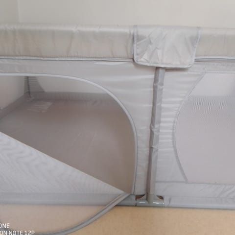 Beige lasten leikkikehä, jossa pehmeät reunat ja verkkosivut näkyvyyden ja ilmanvaihdon parantamiseksi. Yhdellä sivulla on kaari-aukko, jonka voi avata ja sulkea, mikä helpottaa lapsen kulkemista sisään ja ulos. Soveltuu pienten lasten turvalliseen leikki- ja oleskelutilaan sisäkäyttöön.