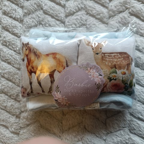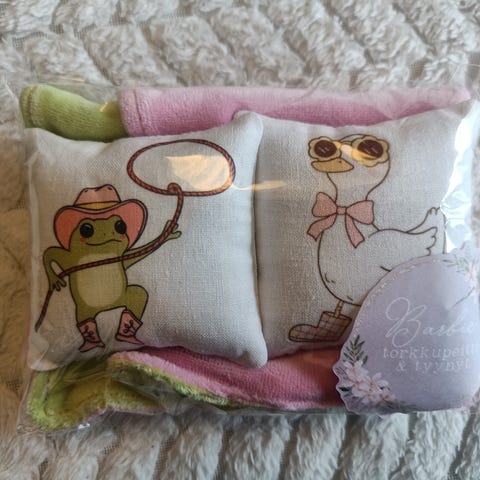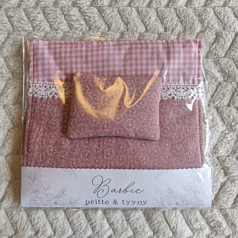 Barbeille kauniita unia tässä suloisessa setissä. Vanutäytteinen tyyny & tikattu vanutäytteinen peitto. Koko Barbeille/ saman kokoluokan nukeille tai pehmoleluille.