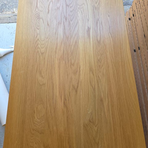 Käytetty kansi on harmaata laminaattia, kulmat on kauniisti pyöristetty. Metallikehä kannen alla. Kromijalat korkeussäädettävät, suositus noin 68 - 76 cm.