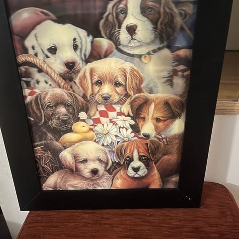 Sisustustaulu jossa koira jonka pään päällä omena.