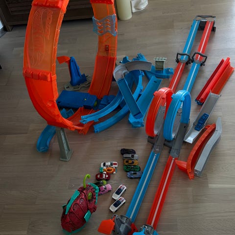 Hot Wheels autoratapaketti leluautoilla. Pakettiin kuuluu useita muovisia autoradan osia, ramppirakennelma sekä erilaisia lähtö- ja maalilaitteita. Mukana on myös useita pieniä Hot Wheels -metallisia leluautoja. Sopii lasten leikkiautoradaksi ja erilaisten rata- ja vauhtileikkien rakentamiseen sisäkäyttöön.