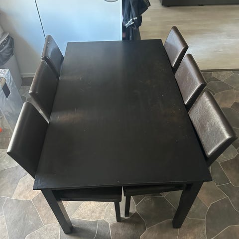 Autuaan liian iso ruokaryhmä meidän keittiöön. Täyspuuta joten painaa kuin mikä ja ei notku ja nitku. Käytönjälkeä, naarmua yms on, mutta pintakäsittelyllä saa mieleisen.