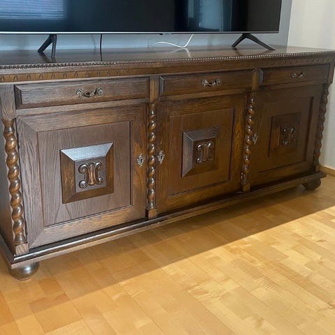 Vanha antiikki senkki peilillä, jossa kaunis fasettihionta. Kaappi on täyttä puuta ja käsin tehty n. 30-40 luvulla luultavasti koivusta. Kaappi on todella siisti ja erittäin kaunis. Leveys 178 cm, syvyys 54,5 cm, korkeus 90 cm + peili osan korkeus 20 cm. Toinen kaapin lukoista kaipaa huoltoa. Senkissä yksi avain. Kaappiin ja laatikostoihin mahtuu valtavasti tavaraa. Eläintalous. Noutomyynti. Mobilepay/käteinen.