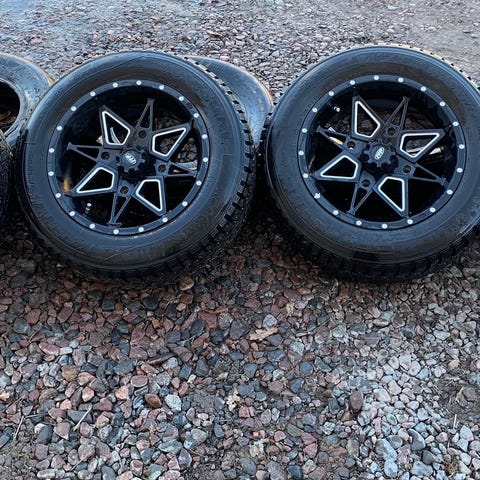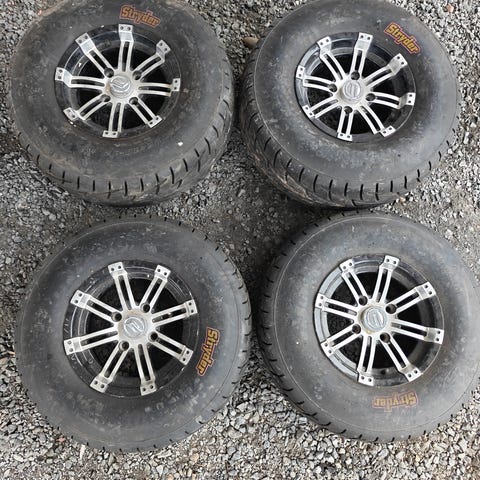 Tällänen rengas vanne setti olis kaupan pintaa on paljon mutta nastoja on irronnut takarenkaista mutta nastojahan voi porata lisää mutta etuset hyvässä kunnossa.
