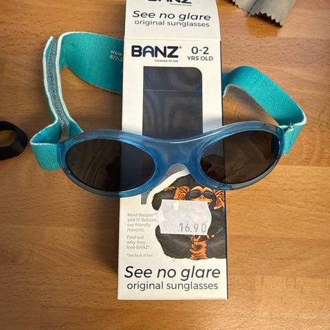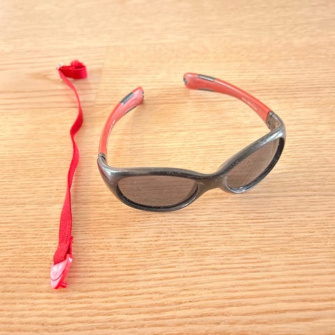 Kietla -aurinkolasit lapsille. Meillä nämä olivat 1-2 -vuotiaan kokoa, vaikka paketissa lukee 2-4-vuotiaille. Mukana alkuperäinen säilytysrasia kantohihnalla. Sangat eivät katkea, sillä ne ovat joustavat. Nämä aurinkolasit antavat tehokkaan suojan lapsen silmille.