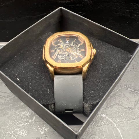 Ostettu vuosia sitten ja jäänyt hyllylle seisomaan. Todella hyvässä kunnossa. Kellon alkuperäinen hinta on muistaakseni n. 200€ (Sain sen kuitenkin alennuksella)