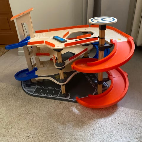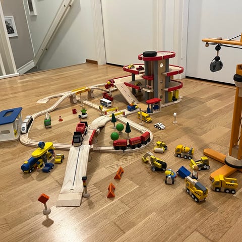 Hyväkuntoinen, pieniä käytönjälkiä (muutama pieni tussijälki pieneltä taiteilijalta). Toimiva hissi. Sopii yhteen esimerkiksi Brio -autoteiden ja junaratojen kanssa sekä Plan City -ratojen kanssa. Kestävä, puinen, vielä monen leikkijän ilo! (Ovh 70-90 e)