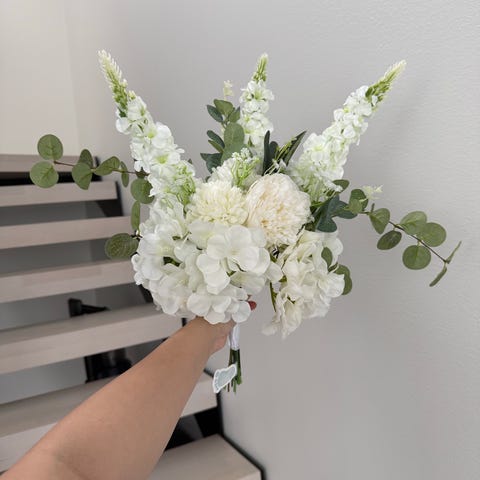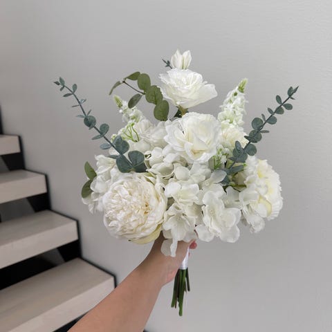 Myyntiin kaunis käsityönä sidottu kestokukkakimppu. Kimppujen sitomiseen on käytetty upeita tekokukkia: hortensiaa, harsokukkaa, pioneja, neilikkaa, krysanteemia, eukalyptysta ja valkoista satiininauhaa 💚