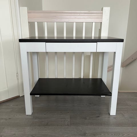 Päällinen lasia, jalat maalattu valkoiseksi.