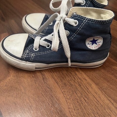Converse All Star lasten tennarit, koko 25. Väri tummansininen, valkoinen kumipohja ja kärki sekä vaaleat nauhat. Unisex-malli, joka sopii sekä tytöille että pojille.