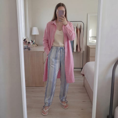 Reilunkokoiset taskut. Lahkeissa kuminauha.
