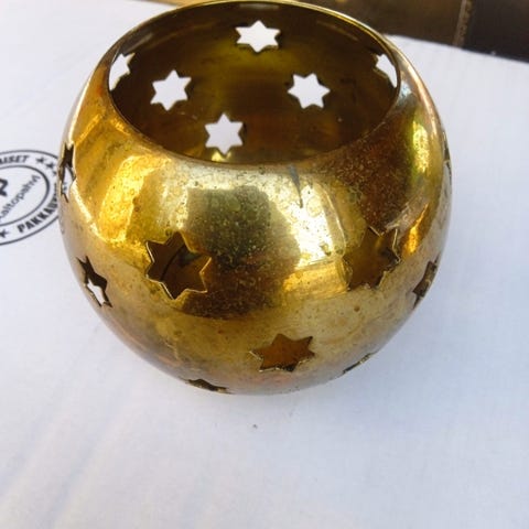 Vanha messinkinen jalka tuikkukynttilälle tai matalalle kynttilälle.