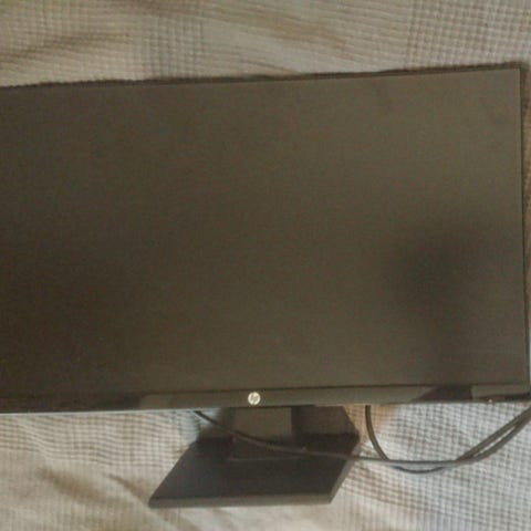 HP 24" näyttö. Näytön koko on 24 tuumaa. Laitteessa on useita liitäntöjä takapaneelissa sekä kaksi USB-porttia sivussa. Soveltuu esimerkiksi tietokoneen perusnäytöksi toimisto- tai kotikäyttöön. Tarkemmat tekniset tiedot, kuten tarkka malli, resoluutio ja liitäntätyypit, eivät käy ilmi kuvista.