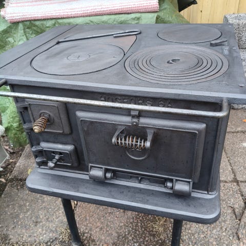 Tästä jollekin entisöitäväksi vanha hella. Högfors 5A