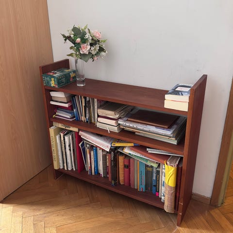 Myydään puinen kirjahylly (polttopuut tai ruukut eivät kuulu kauppaan). Ollut parvekkeella käytössä.
