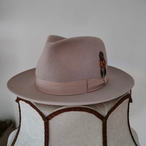 Miesten fedora-tyylinen hattu. Väri musta, ohuet vaaleat raidat. Koko 57 Hatun ympärillä on musta nauha. Sopii käytettäväksi esimerkiksi arkipukeutumisessa tai juhla-asun kanssa.
