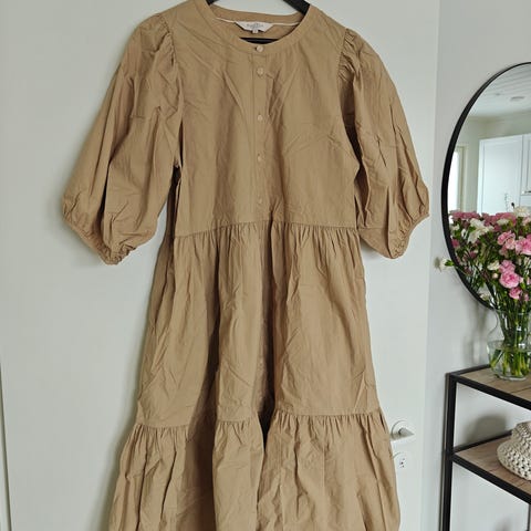 Part Two mekko naisille, koko 40. Väri beige ja materiaali puuvilla. Mekossa on edessä vetoketjukiinnitys, kaulus ja kaksi rintataskua nappikiinnityksellä. Sivussa taskut. Hihat ovat täyspitkät ja niissä on kuminauharypytys hihansuissa. Malli on hieman A-linjainen, pituus noin polven ylä- tai alapuolelle riippuen käyttäjän pituudesta. Mekkoa voi pitää myös takkimekkona auki. Sopii arki- ja vapaa-ajan käyttöön.