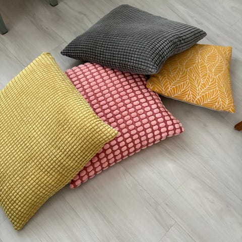 Sisustusjuttuja, väriä vaihtava suihkupää ja laukut sekä kori.